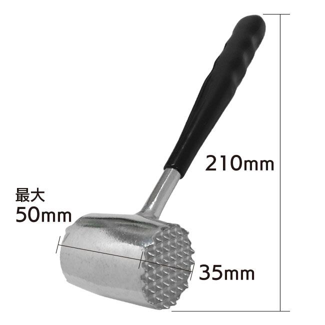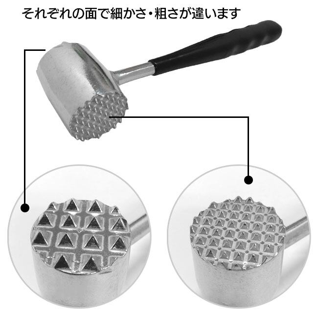 ミートハンマーは、お肉を柔らかくするための必須キッチンツールです。ダイキャスト製で、耐久性があり、長期間使用しても錆びにくい構造です。両面に異なるテクスチャの面があり、凹凸で叩くことにより、お肉に深く浸透して柔らかさを増します。ハンドルは握りやすく、滑りにくい素材で作られており、手にフィットして安定した使用が可能です。また、重量バランスが良く、少ない力で効果的にお肉をたたくことができます。掃除も簡単で、食洗機対応なので、手入れの手間も省けます。ミートハンマーは、ステーキやチキンカツ、豚カツなど、さまざまな料理でお肉を柔らかくし、料理の質を向上させる頼もしいアイテムです。